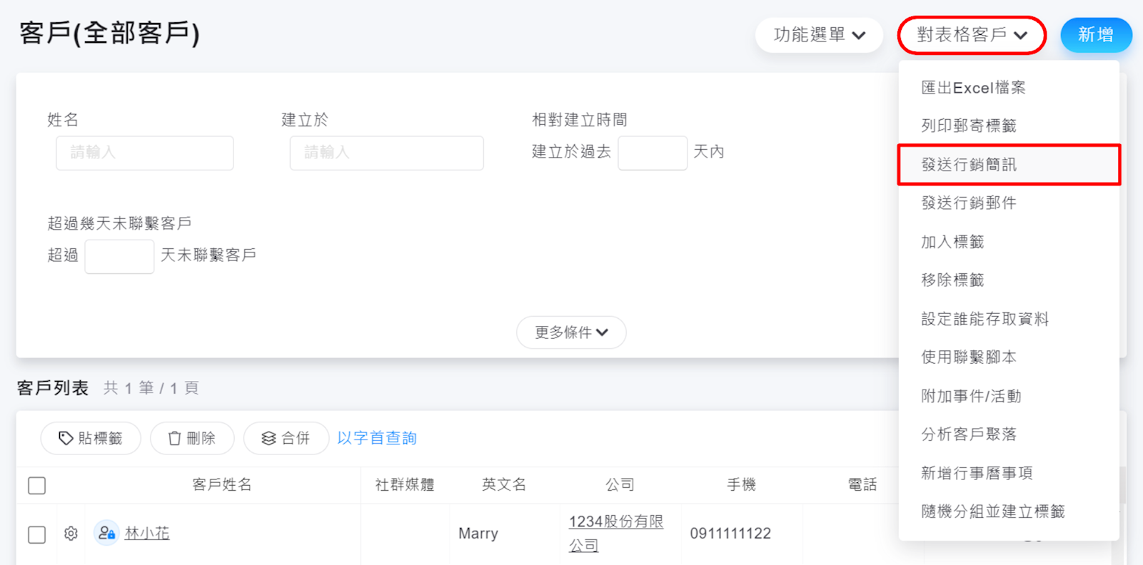 2. 查詢後,在客戶列表右上角點擊【對表格客戶>發送行銷簡訊】,選擇您的範本或直接編輯內容。