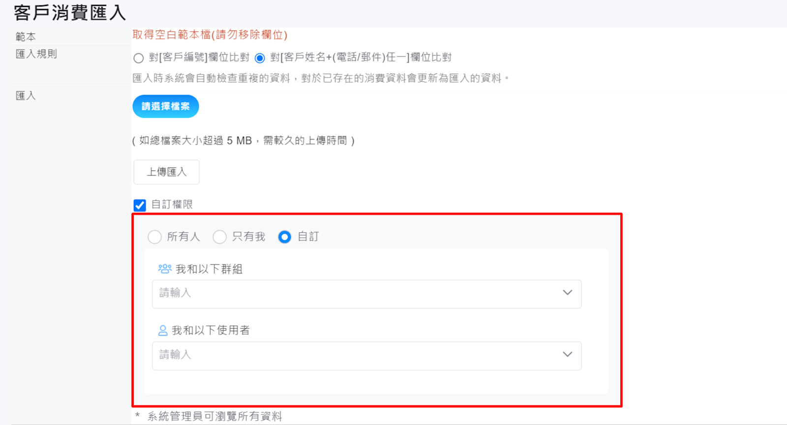 1. 若不勾選【自訂】,該批消費資料將跟隨相關客戶資料的權限。