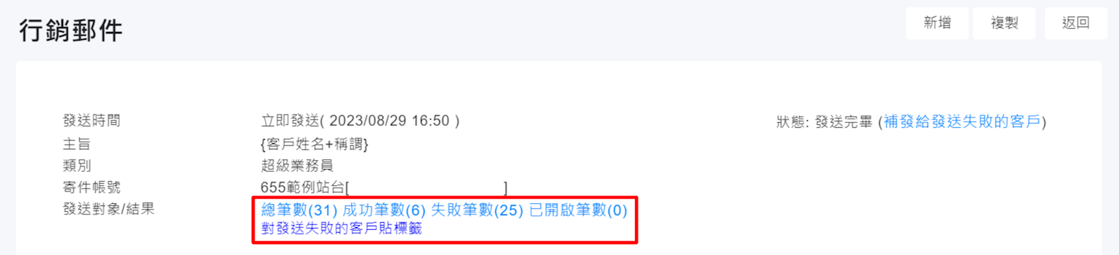 1. 請分別對【成功筆數】、【失敗筆數】、【已開啟筆數】貼上特定標籤(若僅需【成功筆數】,只要對該列表中的客戶貼上標籤即可,其他亦同)。