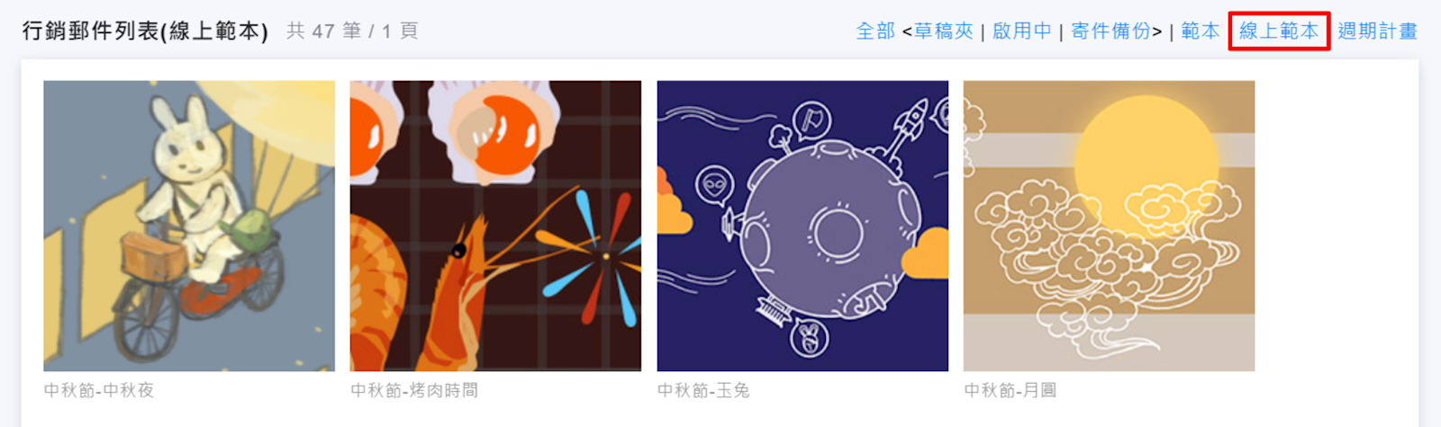 您可以從列表左下方【行銷郵件】進入,接著點選右上方【線上範本】來進行線上範本的使用。