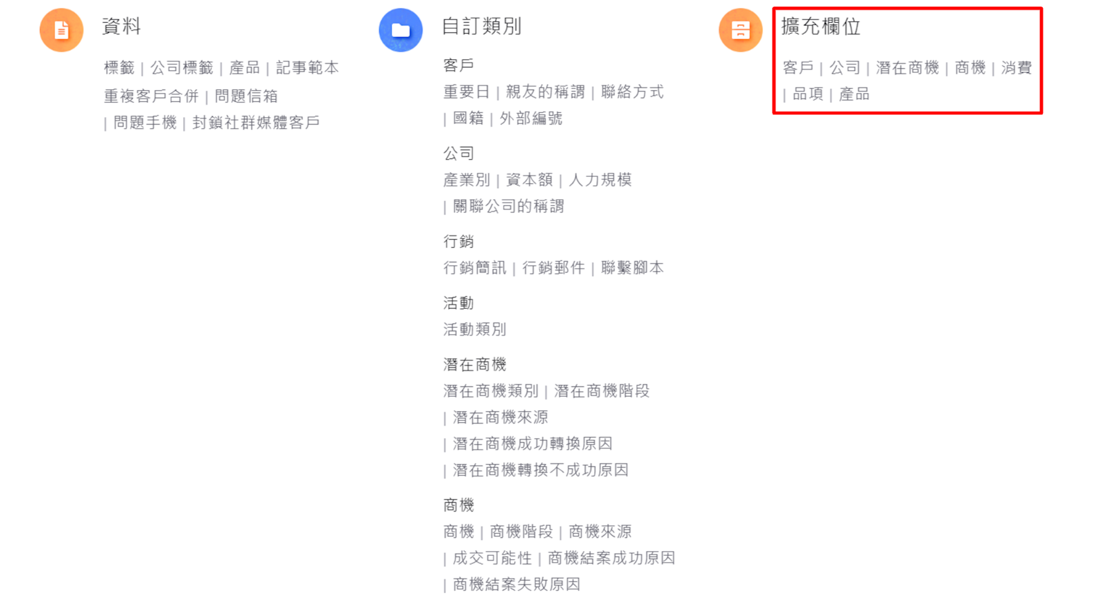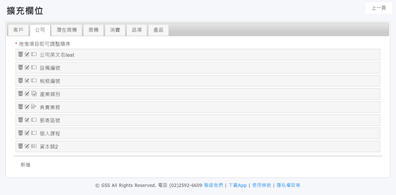 1. 請至列表左下方點選【管理>擴充欄位】,選擇要新增的擴充欄位後,點選【新增】。