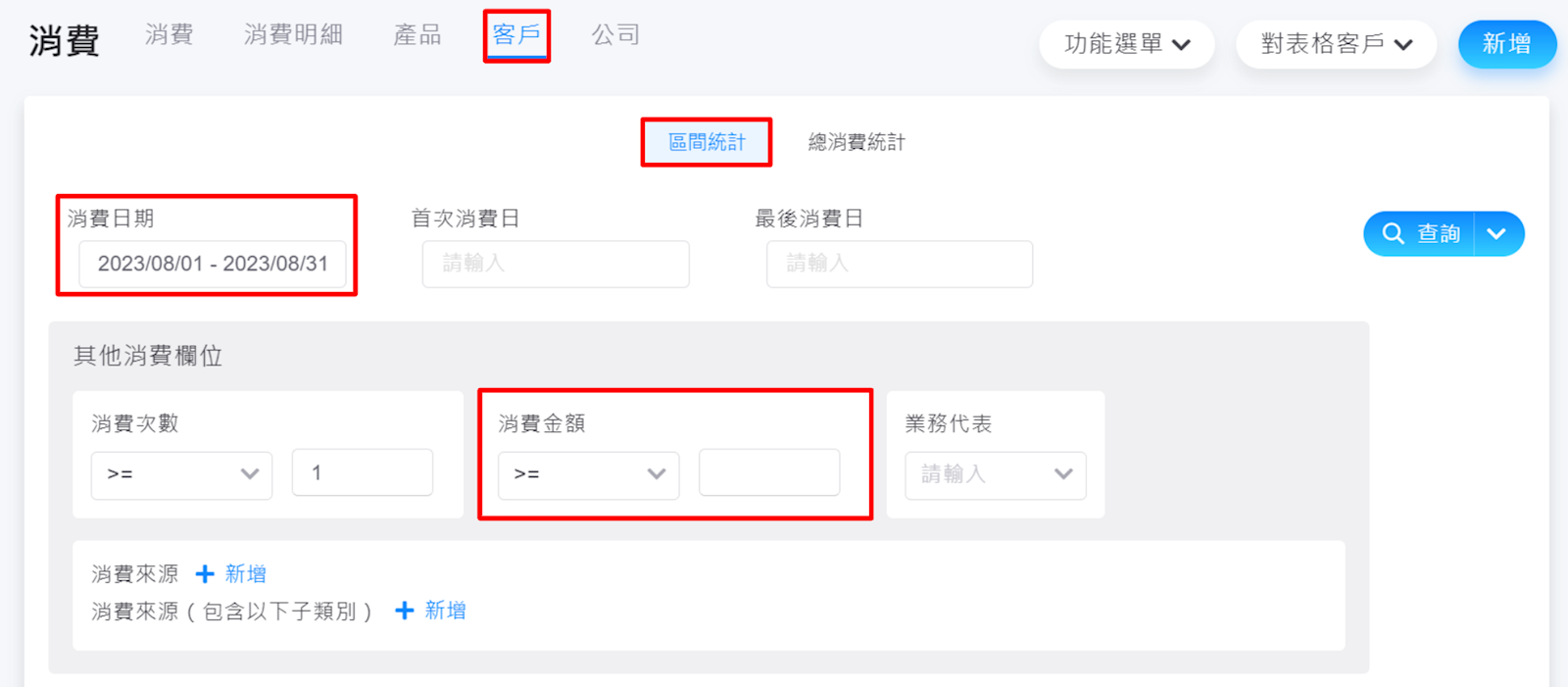 請至列表下方【消費>客戶>區間統計>消費日期】,接著點選【更多條件>其他消費欄位>消費金額】,並輸入消費金額(請記得選擇>=),輸入完畢點選右方搜尋之後就可找到符合條件的名單。