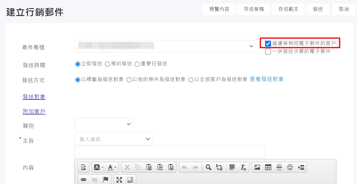 系統預設不會重複寄送給相同電子郵件的客戶,您可以於左側工具列點選【行銷郵件】,點選【新增】後右上方可以查看。