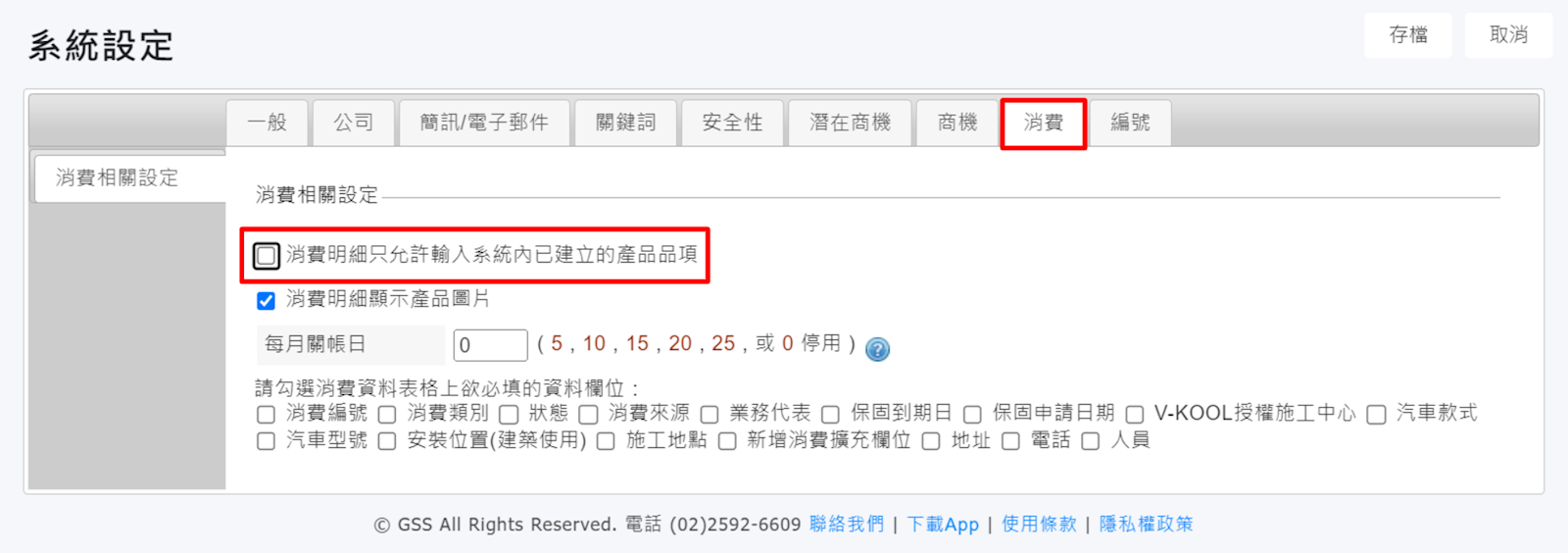 2. 進入頁面後,在上方列表中選擇【消費】,於【消費相關設定】欄位最下方,取消勾選【消費明細只允許輸入系統內已建立的產品品項】,即可在新增消費時,直接輸入系統內未建立的產品。