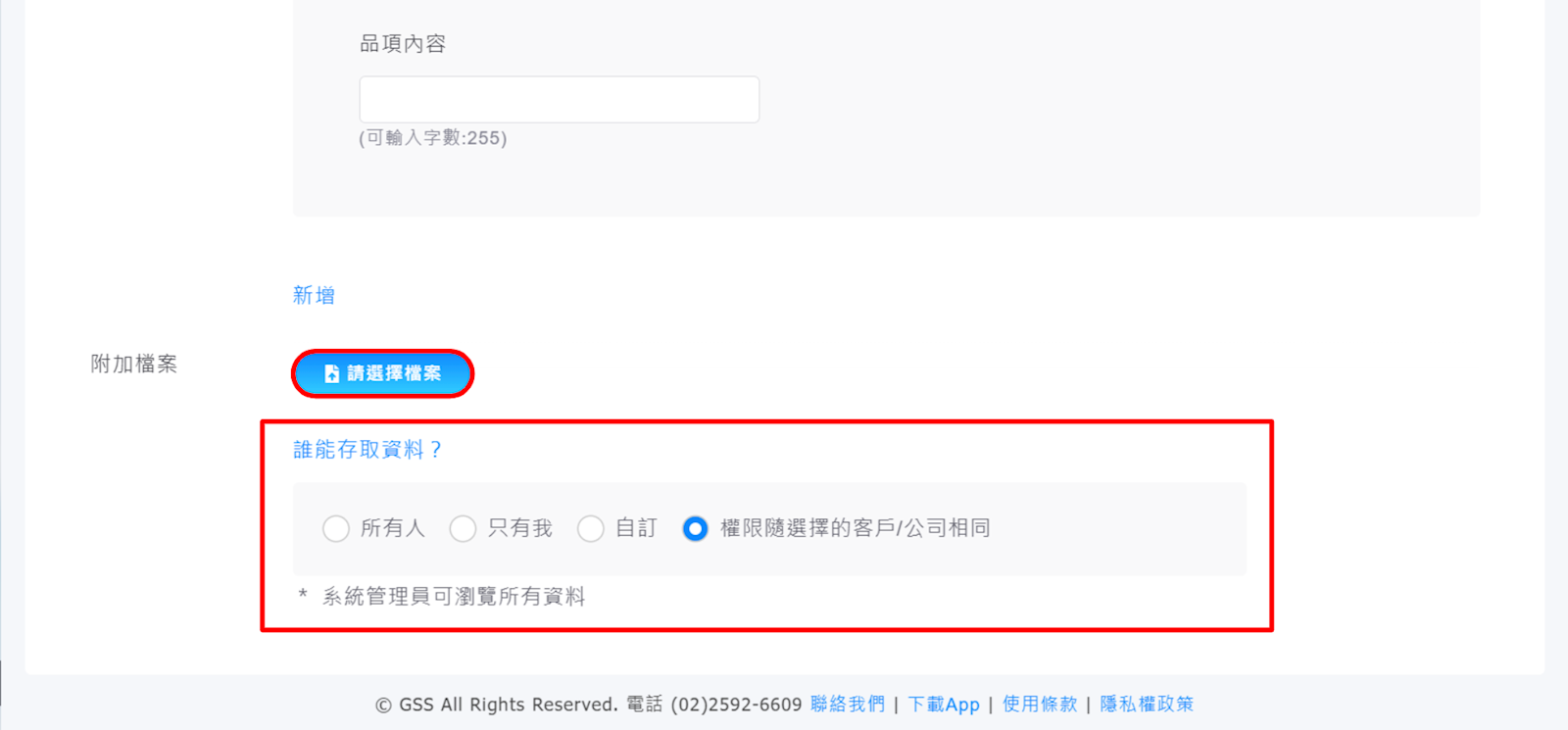 4. 設定【誰能存取資料】的權限。提醒您,系統管理員可瀏覽所有資料。