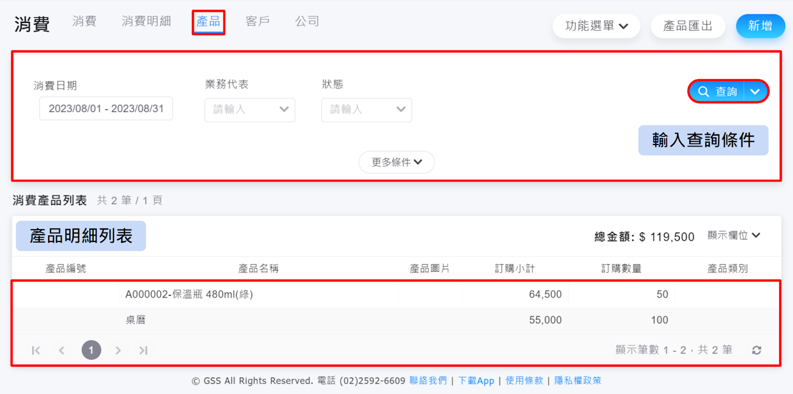 2. 您可以在此輸入查詢條件,並且瀏覽產品明細列表。