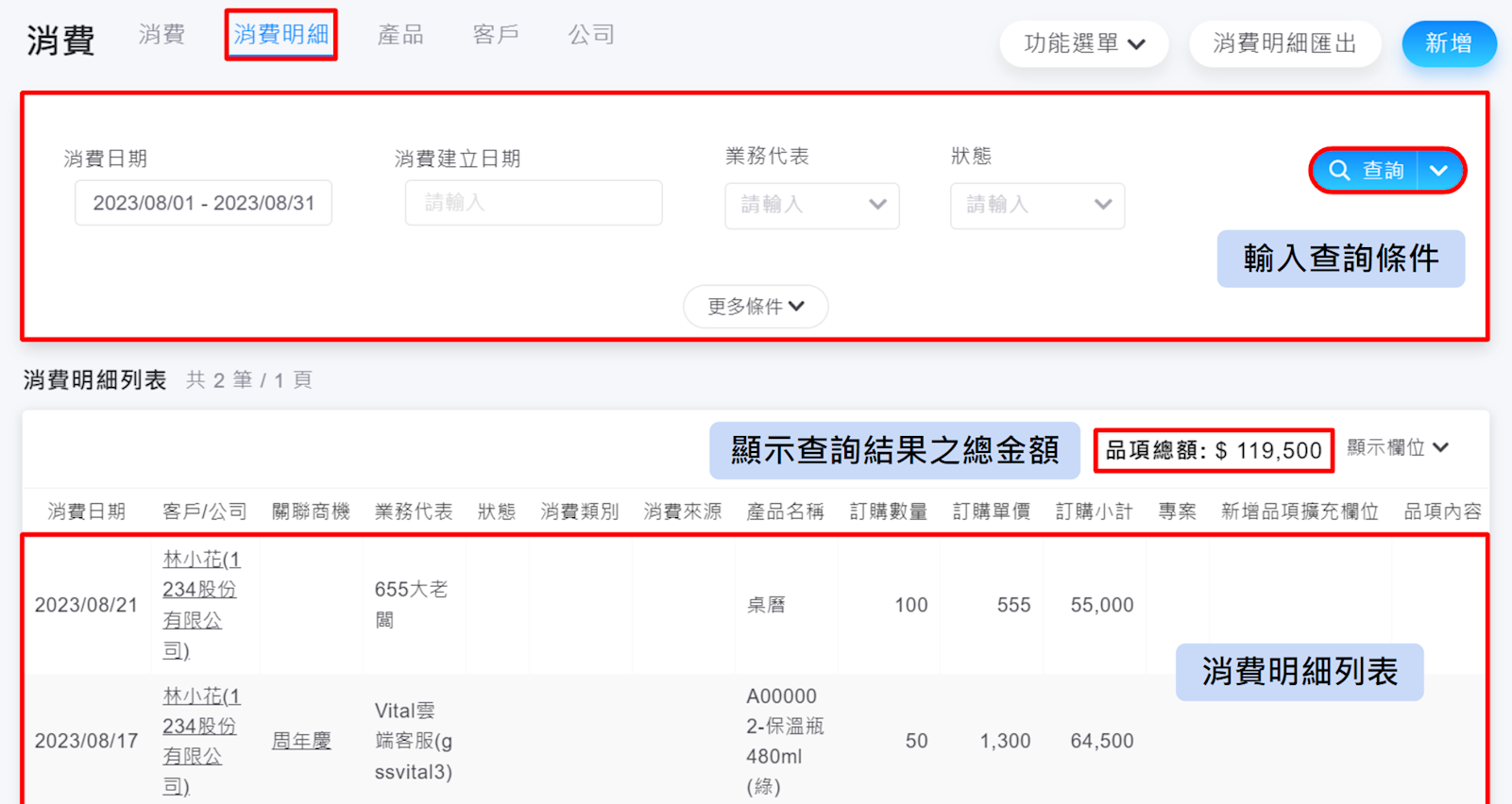 2. 如圖,您可以在這裡輸入條件查詢客戶消費明細。