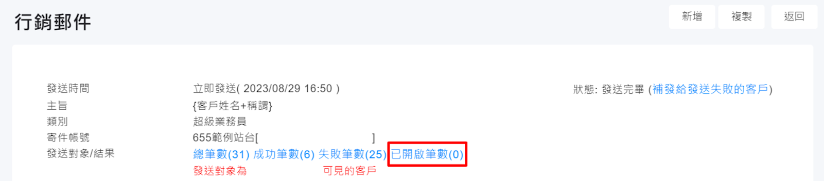 請進入該郵件中點擊【已開啟筆數】,確認名單之後,即可點選【對已開啟筆數的客戶貼標籤】開始對此名單貼上/建立標籤。