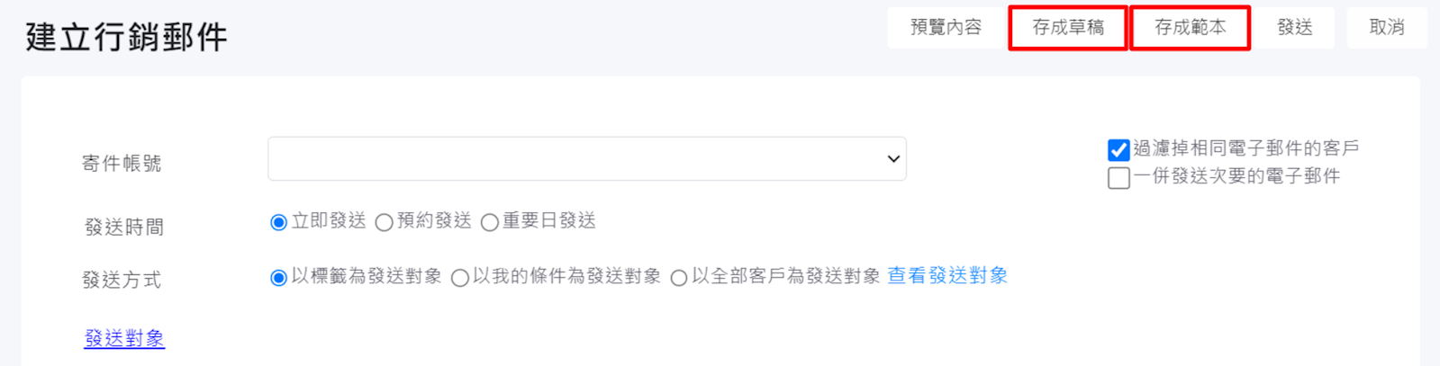 建立行銷郵件時,除了可以直接發送郵件外,也可以將信件【存成範本】或【存成草稿】,此二項功能的差異為該郵件的內容及設定是否完成。