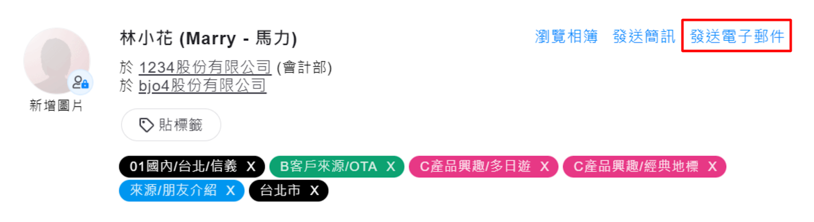 請至列表左上方點選【客戶】,選擇客戶個人資料頁,點選右上方的【發送電子郵件】,系統會直接帶入該客戶的電子郵件地址。