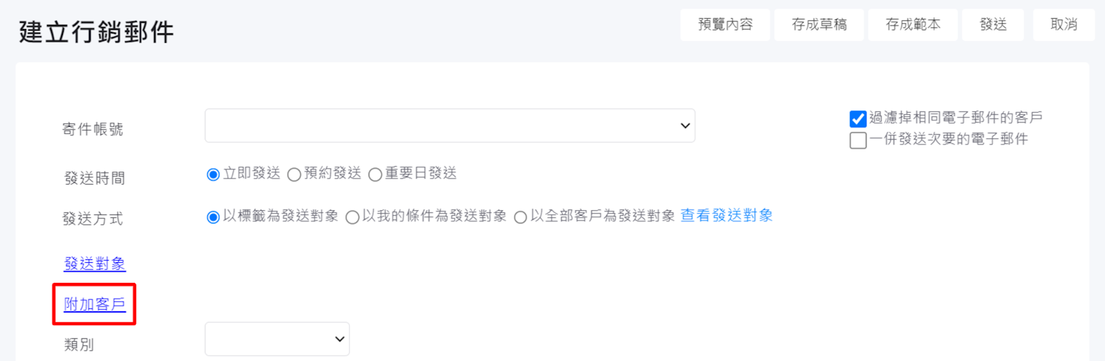 請至列表左下方點選【行銷郵件>新增>建立行銷郵件>附加客戶】,選擇個別客戶發送。