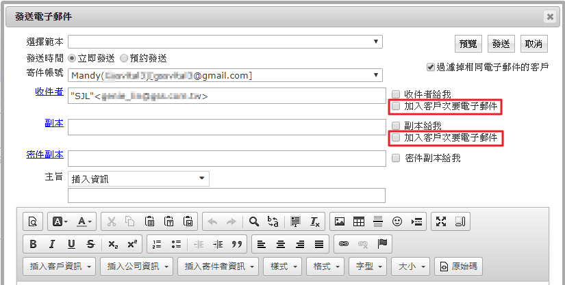 一、請至列表左上方選【客戶】從客戶頁面寄送信件:【收件者】或【副本】欄位可以勾選【加入客戶次要電子郵件】。