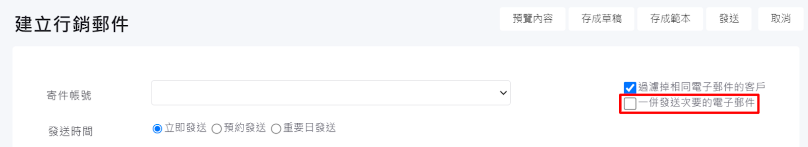 二、請至列表左下方行銷郵件範本設定:請於信件右上角勾選【一併發送次要的電子郵件】。