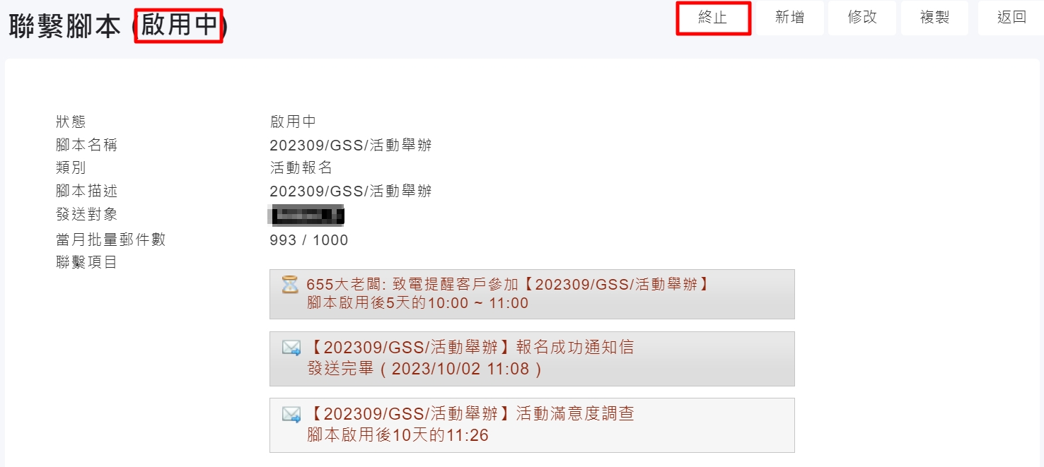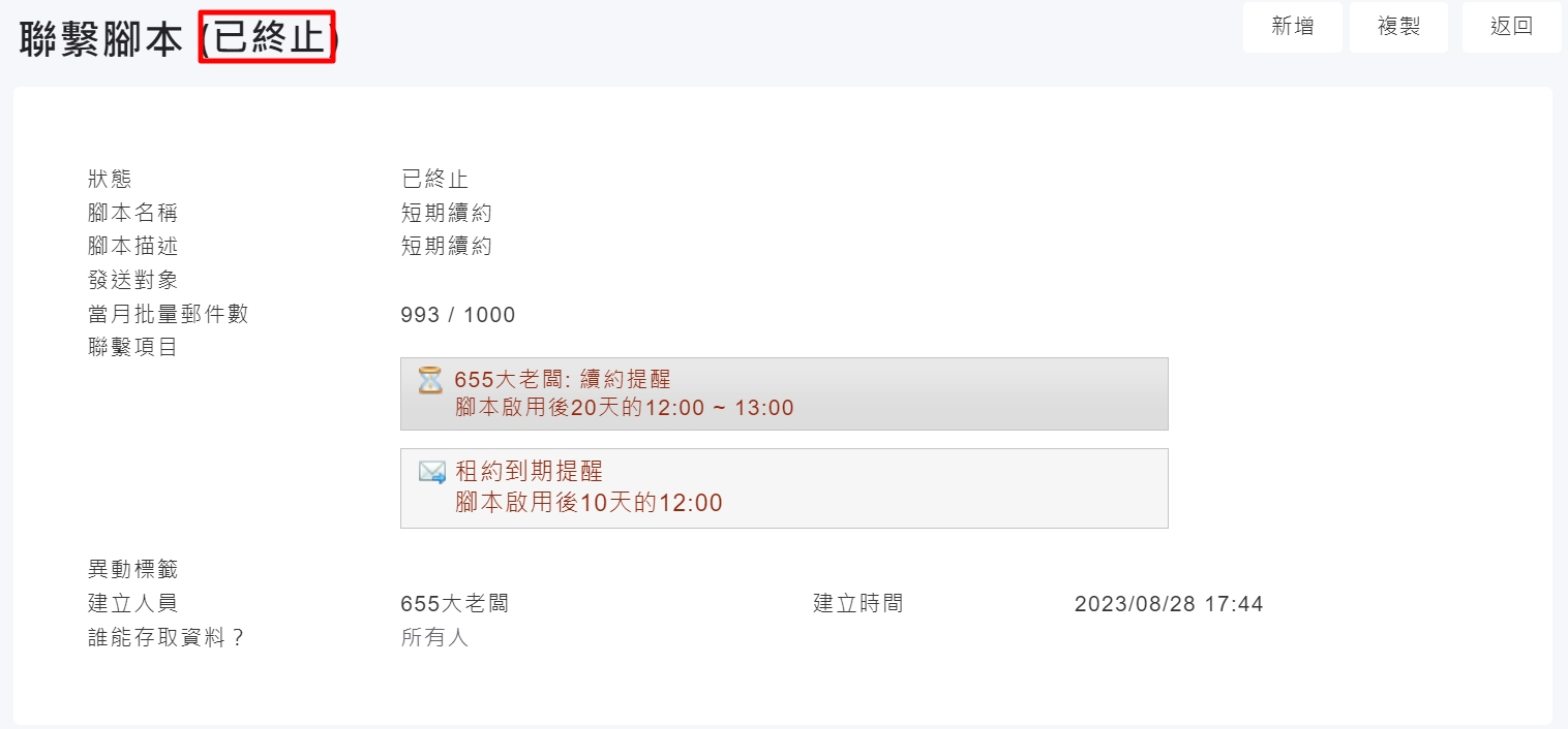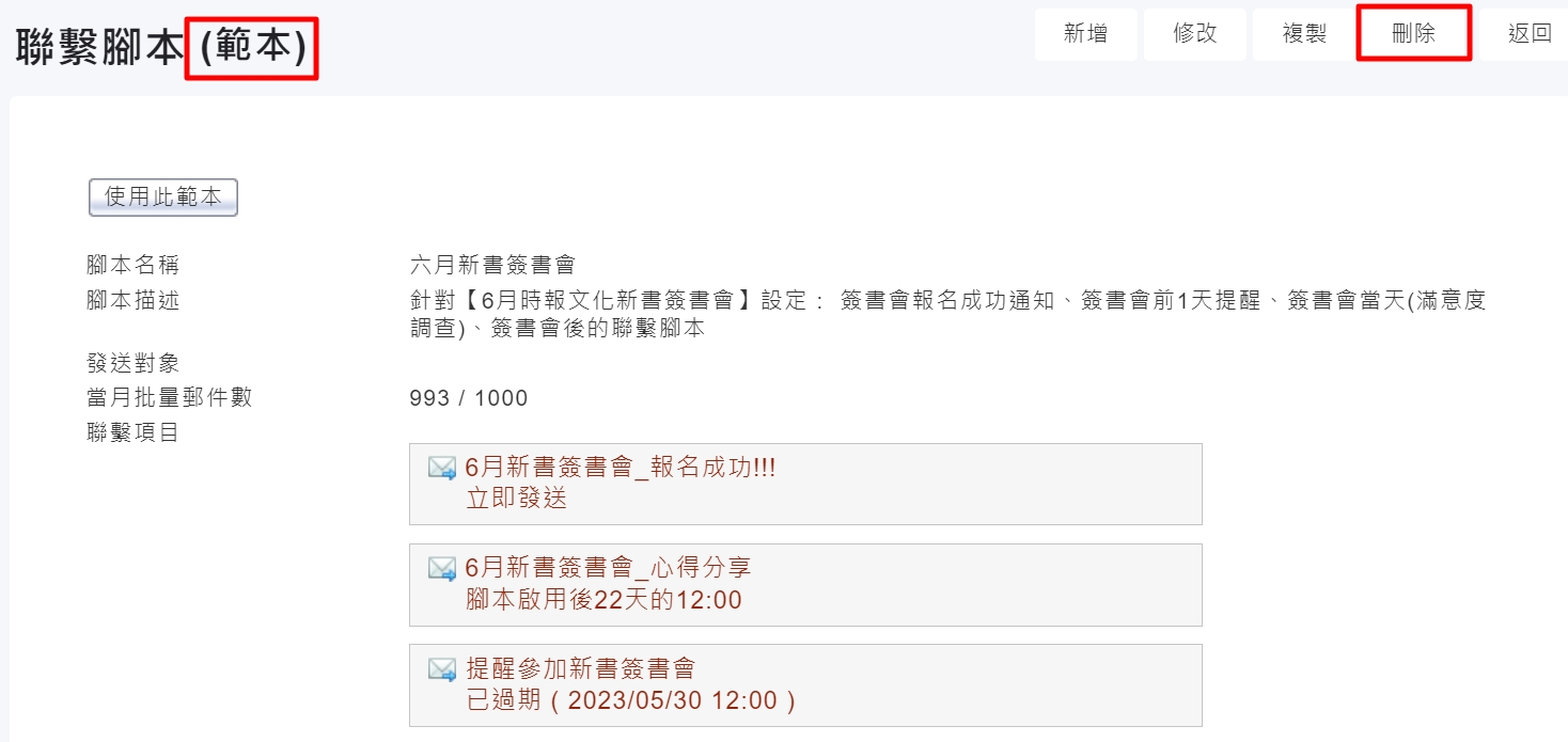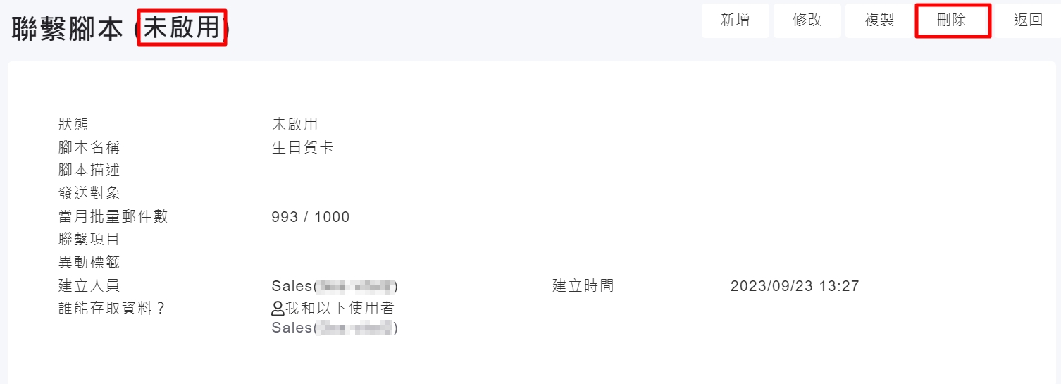 以下列舉能否刪除不同狀態下的「聯繫腳本」: