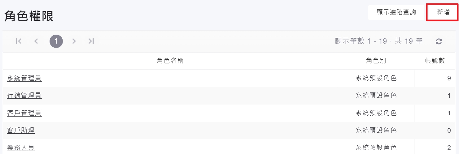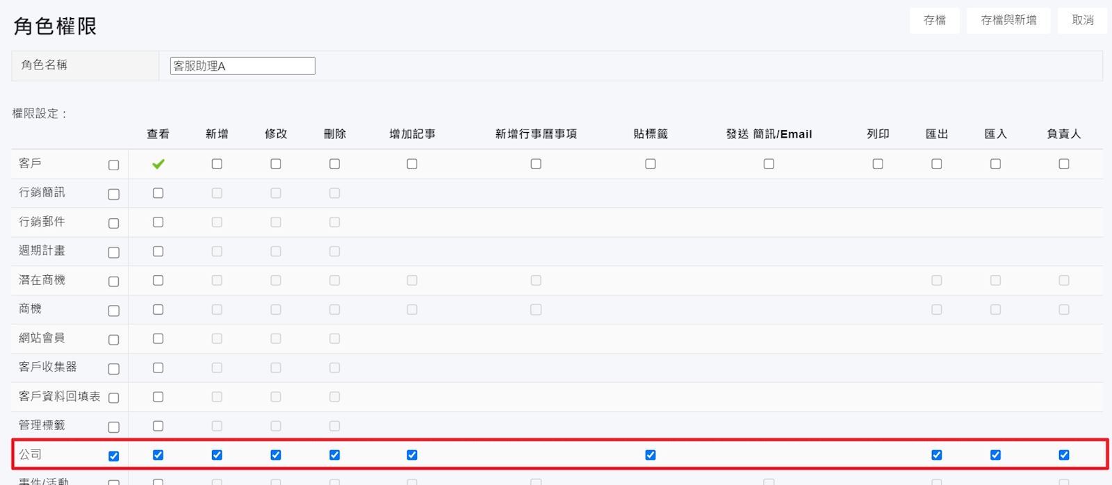 ※系統預設的角色,如系統管理員、行銷管理員、客戶管理員、客戶助理、業務人員,原有的權限皆不可更改,各預設角色編輯「公司」的權限,可至角色權限表中查詢;若要對原有角色開放「公司」權限,可依照以上操作新增一個自訂角色,使用者可同時擁有預設角色與自訂角色的權限。