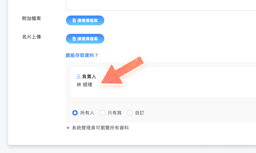 於「管理 > 系統設定 > 安全性」加入了可以啟用的項目「允許沒有負責人權限的帳號,新增資料時自動帶入自己為負責人」,預設為關閉,開啟後可以讓沒有「指定特定類型資料負責人」權限的使用者,在新增各類有負責人的資料時,自動將自己帶入為負責人。