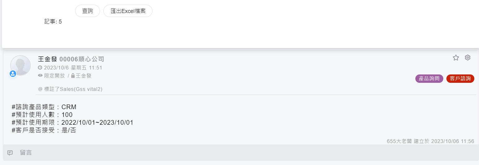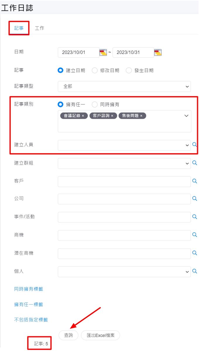 *依此情境為例,您可以篩選出日期、建立人員(ex:業務)、記事類別,找出記事後匯出。