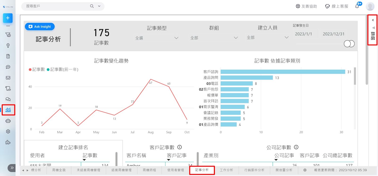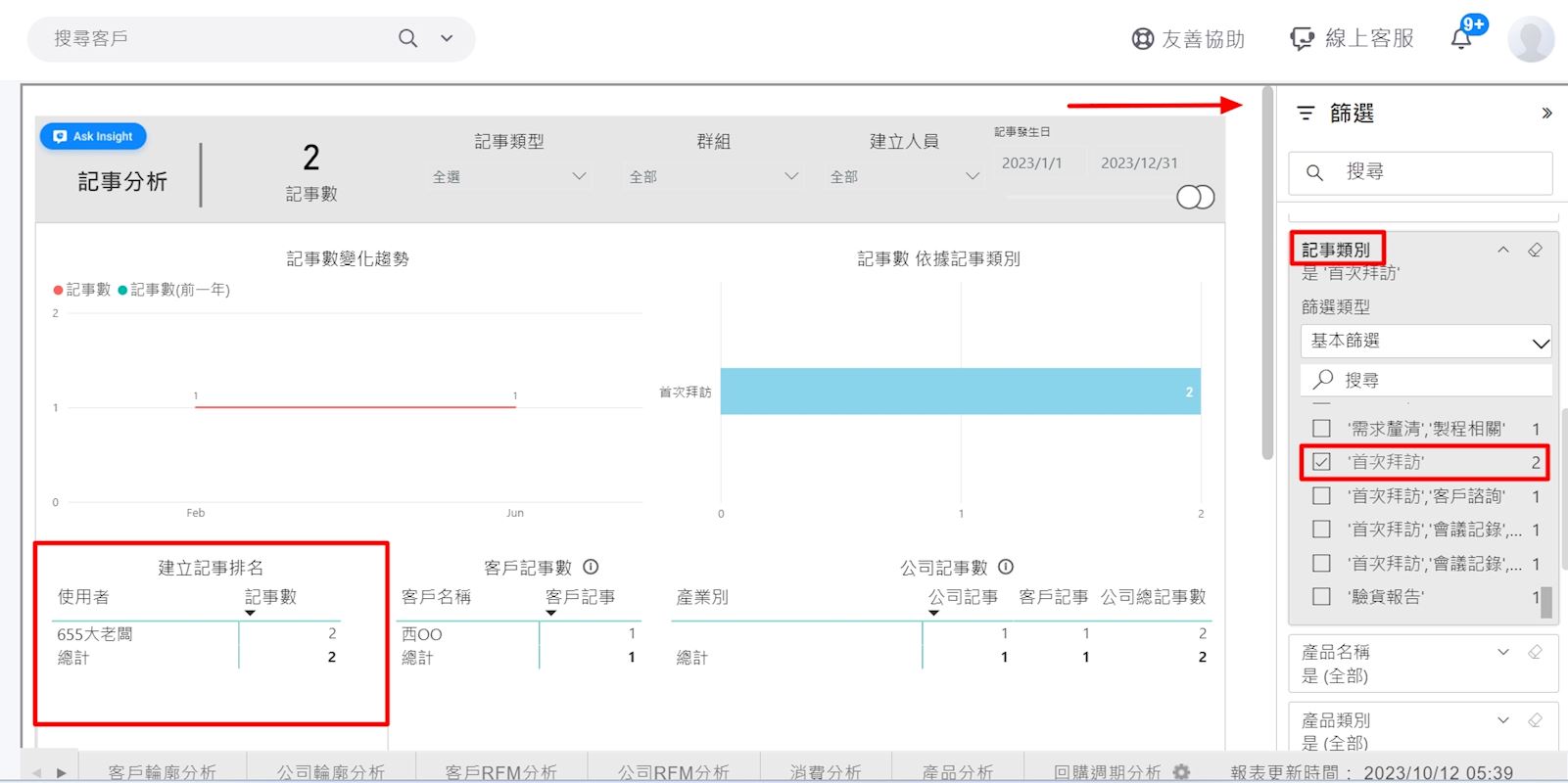 1. 點入系統左側的【insight 分析】,進入畫面後,將下方的頁籤切換成「記事分析」,接著打開右方的「篩選」。
