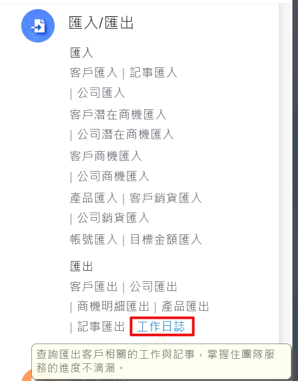 1. 點選【管理>匯入/匯出>工作日誌】。