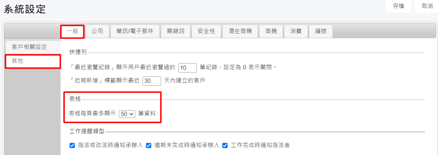 請至【管理>系統設定>一般>其他>表格】,可於此選擇列表顯示筆數。