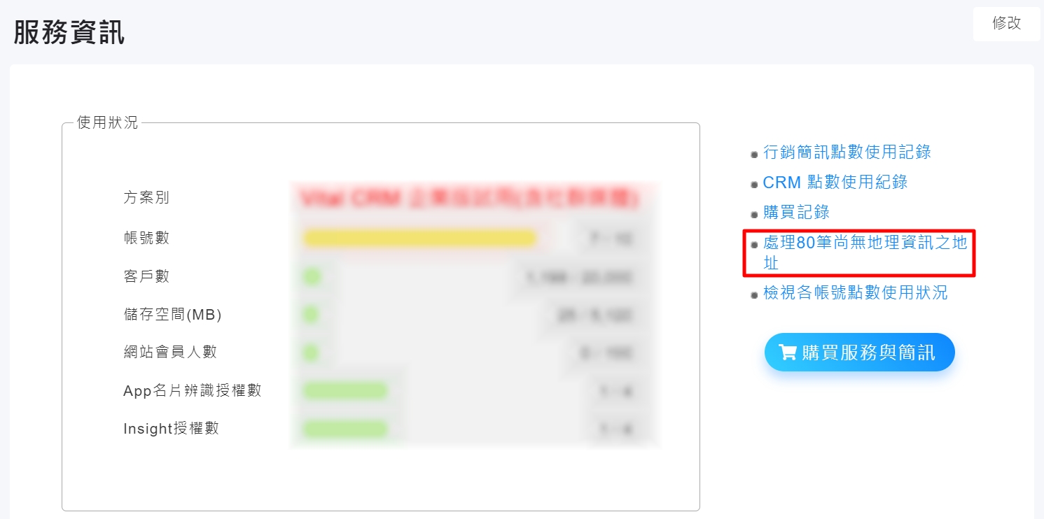 請系統管理員至【管理>系統>服務資訊】,右方有個「處理尚無地理資訊之地址」功能,在這裡可以全數同步客戶資料的地址資訊。