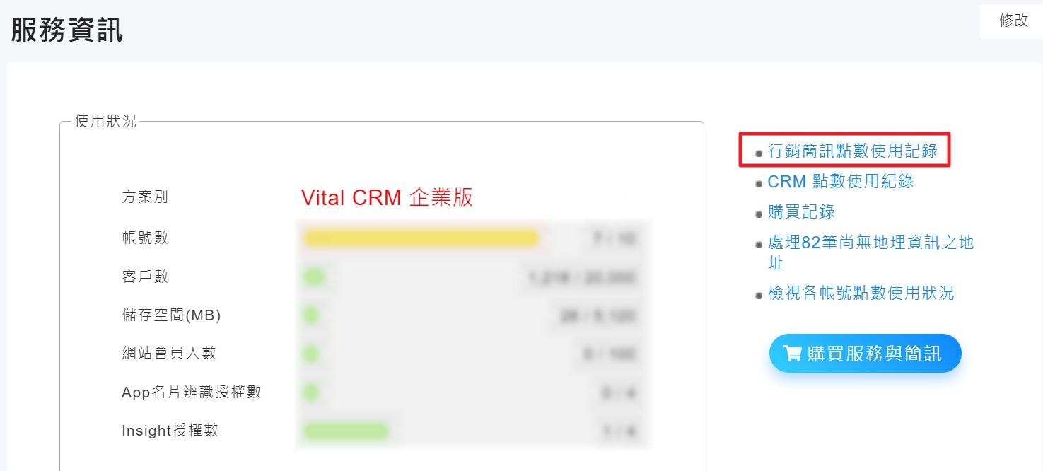 請至【管理>系統>服務資訊】右側點擊「行銷簡訊點數使用記錄」中查詢。