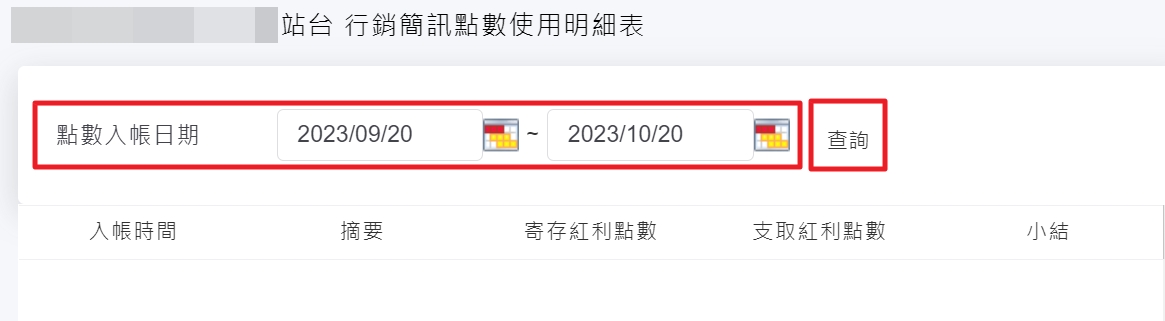 在「行銷簡訊點數使用記錄」中,您可以依據日期作篩選,並查看點數的使用狀況和剩餘的點數。