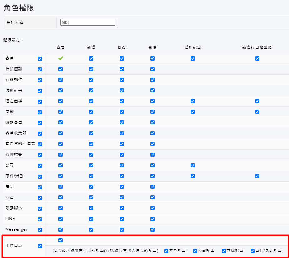 若想設定工作日誌「查看」與「匯出」的權限,並將「匯出可見記事」歸類到工作日誌權限的子項目中,使管理者能夠一目了然,更加方便釐清權限設定的影響範圍,可請管理員至【管理>角色權限】中進行設定。