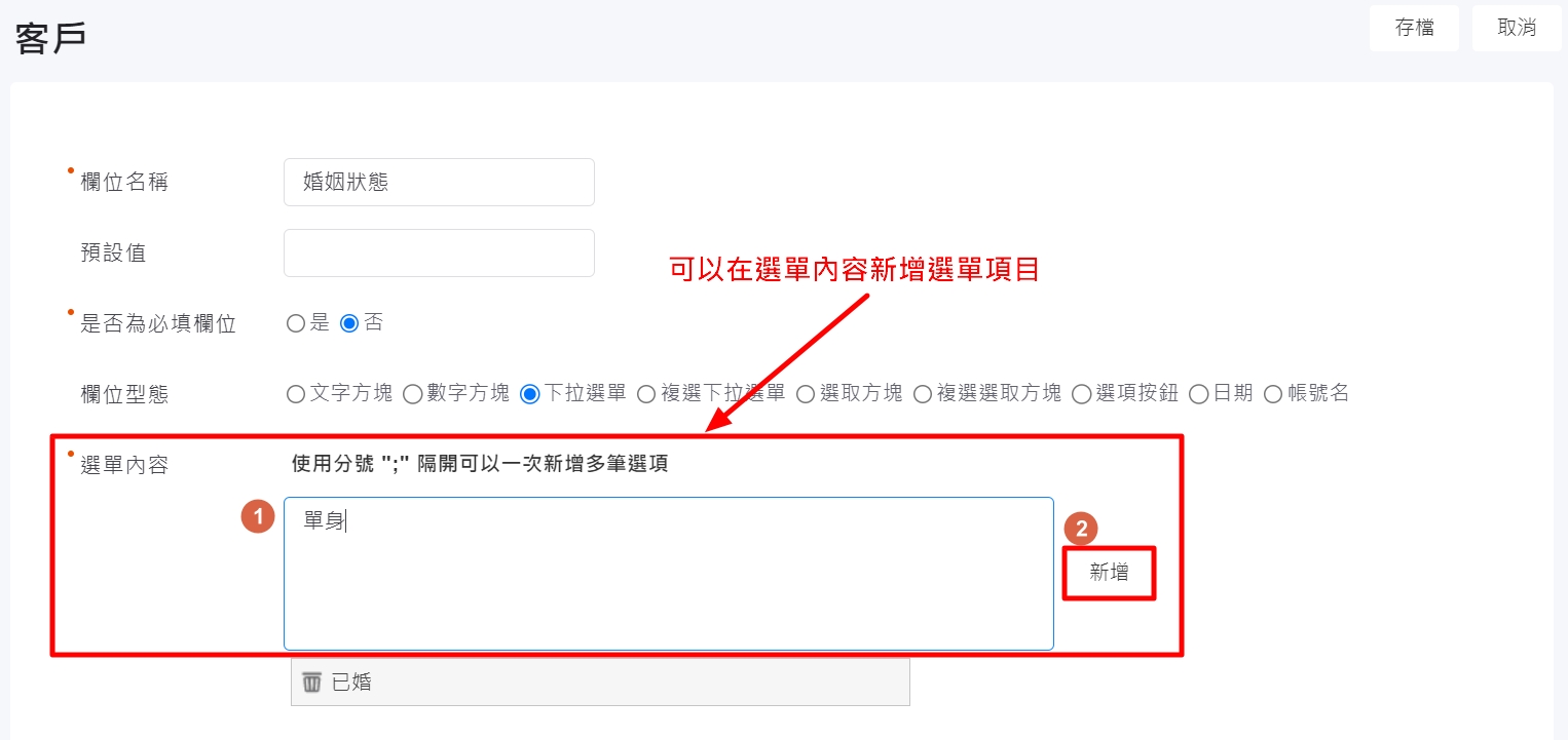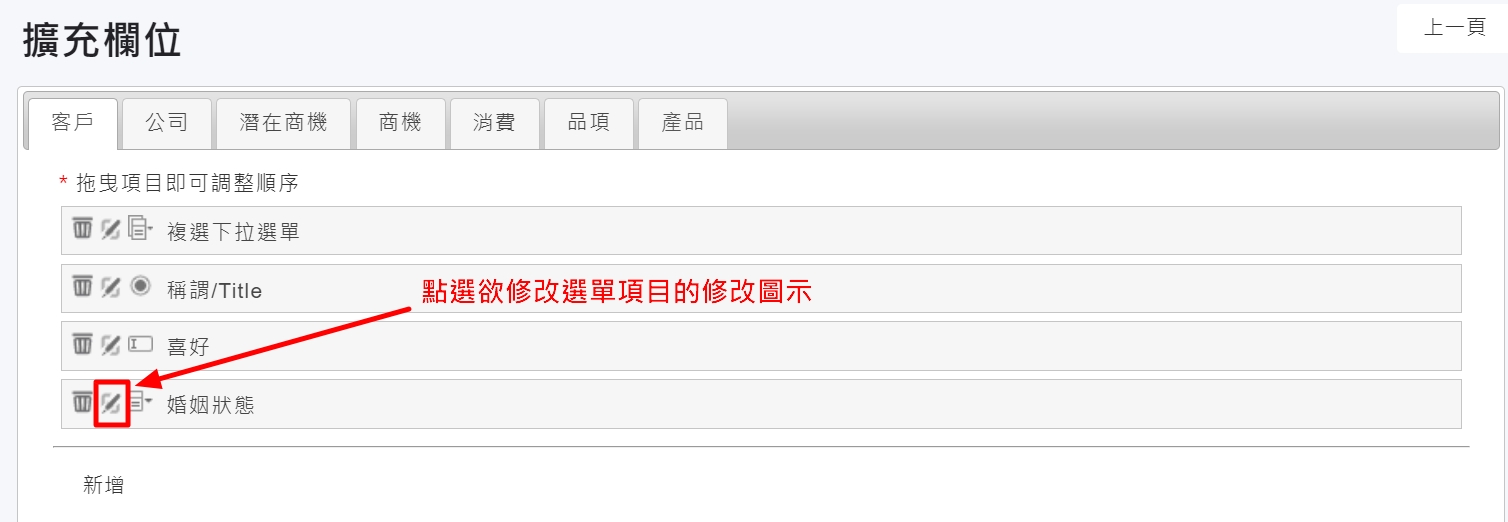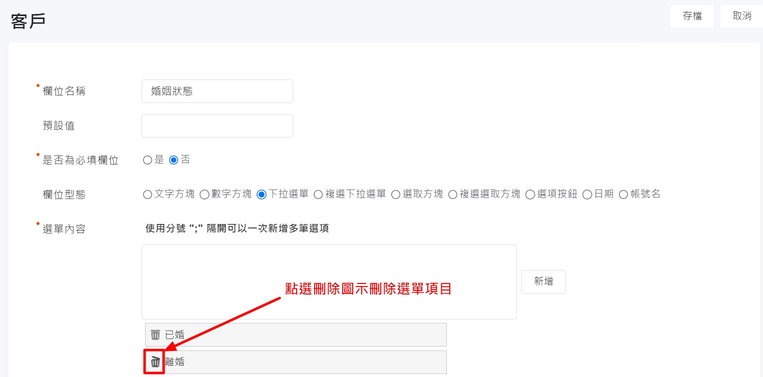 請至【管理>擴充欄位】,進入欲修改的選單項目中,將該項目刪除即可。
