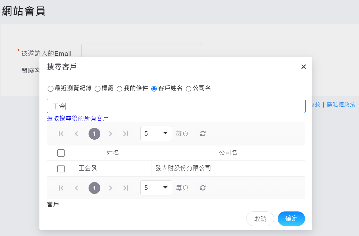 3. 請輸入被邀請人的Email,再搜尋與該會員的關聯客戶。點擊「搜尋客戶」可以根據「最近瀏覽紀錄」、「標籤」、「我的條件」、「客戶姓名」、「公司名」來進行查詢。