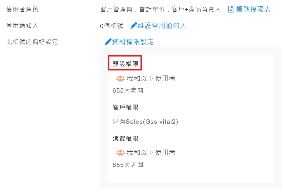 系統原有的一組偏好設定稱為「預設權限」,而其他個別資料,如:客戶、公司、事件/活動、商機、消費、記事、工作等功能的資料權限如何設定呢?