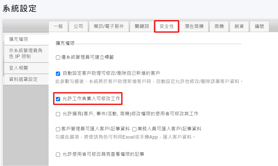 點擊【管理>系統設定>安全性>擴充權限】,勾選「允許工作負責人可修改工作」,被指派工作的負責人就可以修改指派到自己身上的工作。