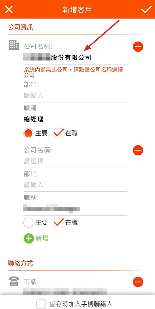 3. 資訊辨識完成後,您可以檢查是否有誤,如果該客戶所屬的公司尚未儲存在系統中,在「公司資訊」欄位下方會顯示紅字訊息,如下圖所示。點擊該公司名稱後,即可進入到新增公司的頁面。