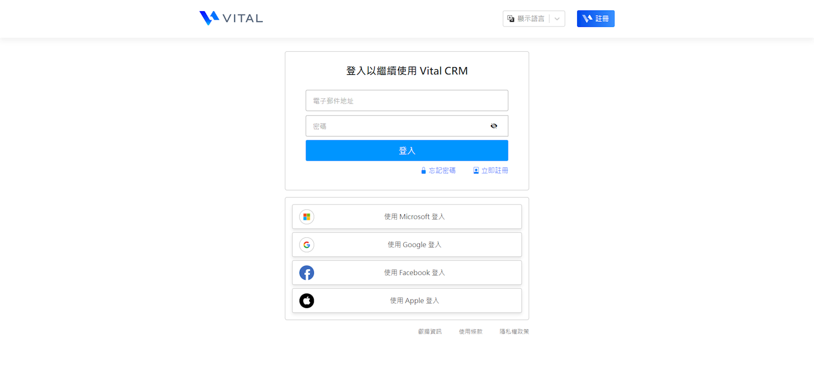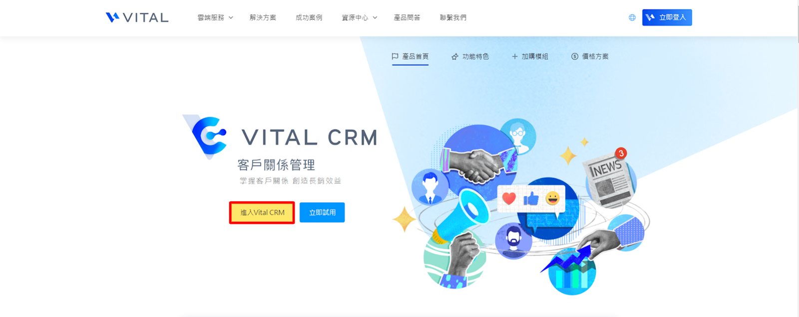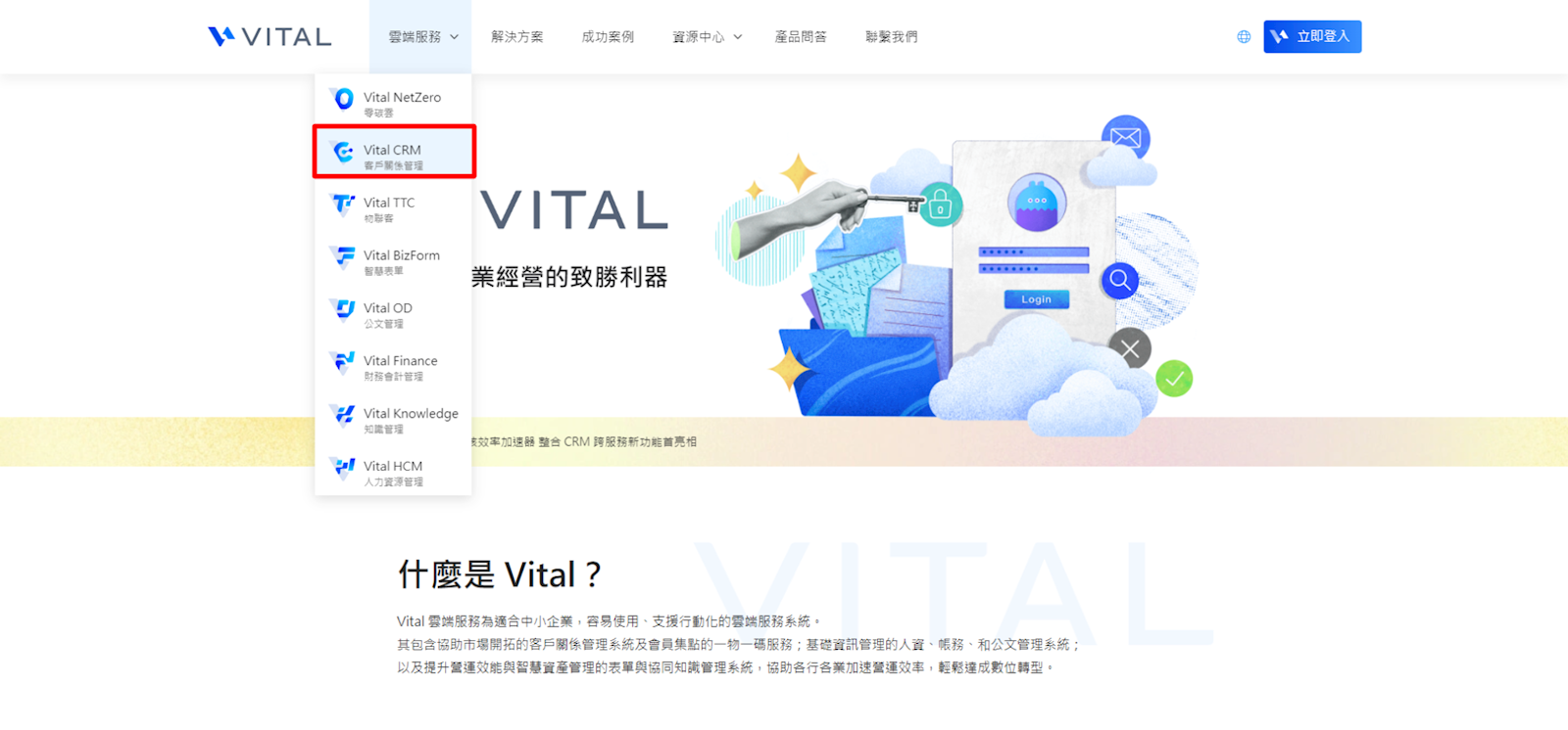 1.由Vital雲端服務官網進入(點我前進官網),找到Vital CRM,並於畫面中點選【進入CRM】