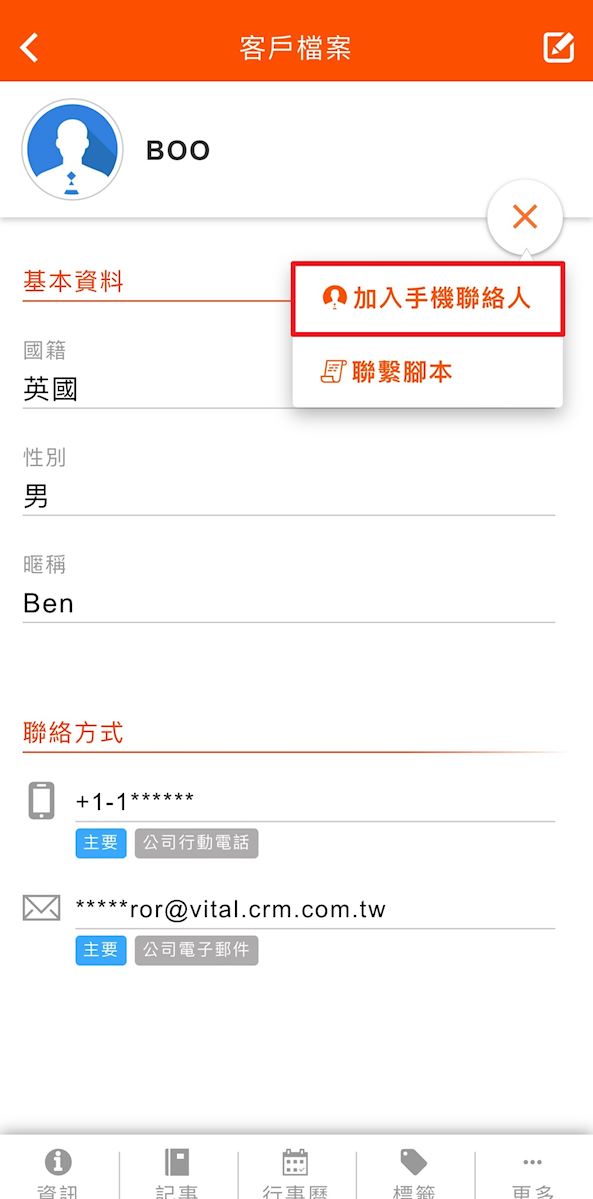*提醒:如果無法加入手機聯絡人,要先到應用程式設定,允許 Vital CRM 取用手機聯絡人。