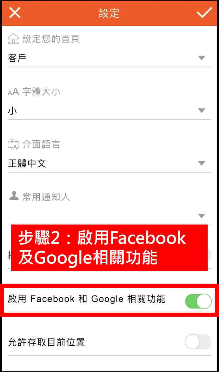 將Facebook及Google相關功能啟用,點選勾勾,就可將APP中我的附近的文字從簡體變成繁體字