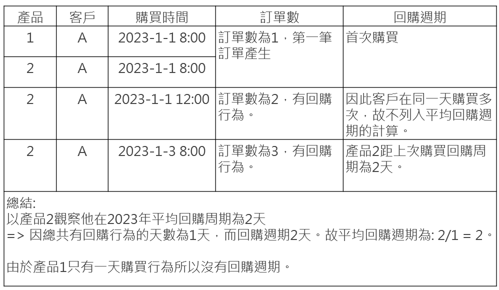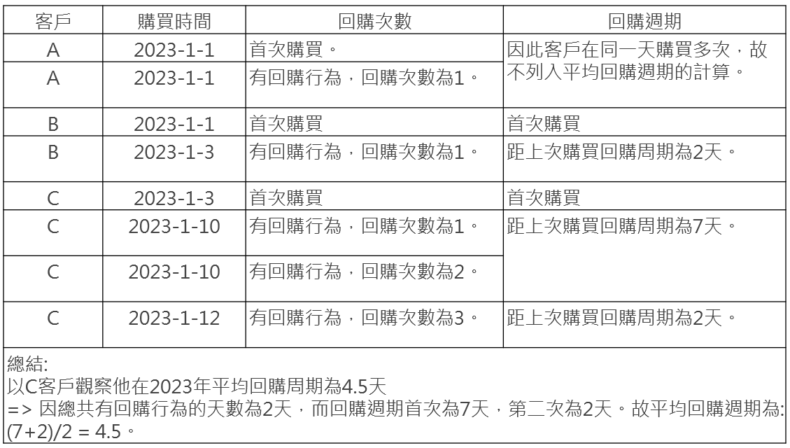 而在計算回購週期時,因為分析的觀點為此顧客多久會回來消費,以便在時間即將到達此顧客的回購週期時來做行銷。故計算方法會以天為單位,也就是當天的多次購買都會算做一筆,避免在做行銷策略時有誤判。