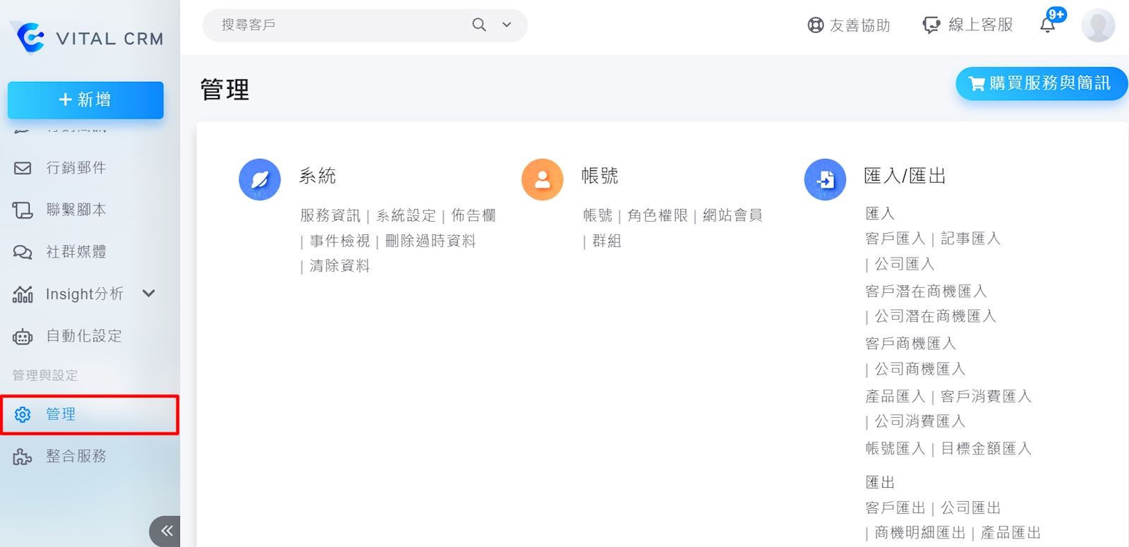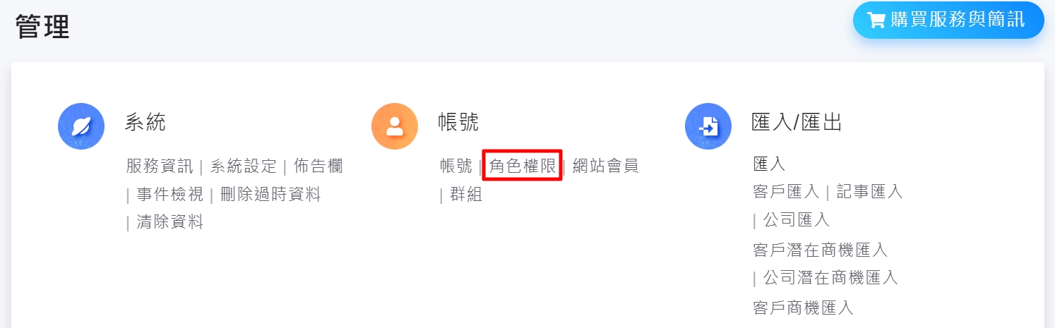 2. 進入管理畫面後請點選【帳號>角色權限】