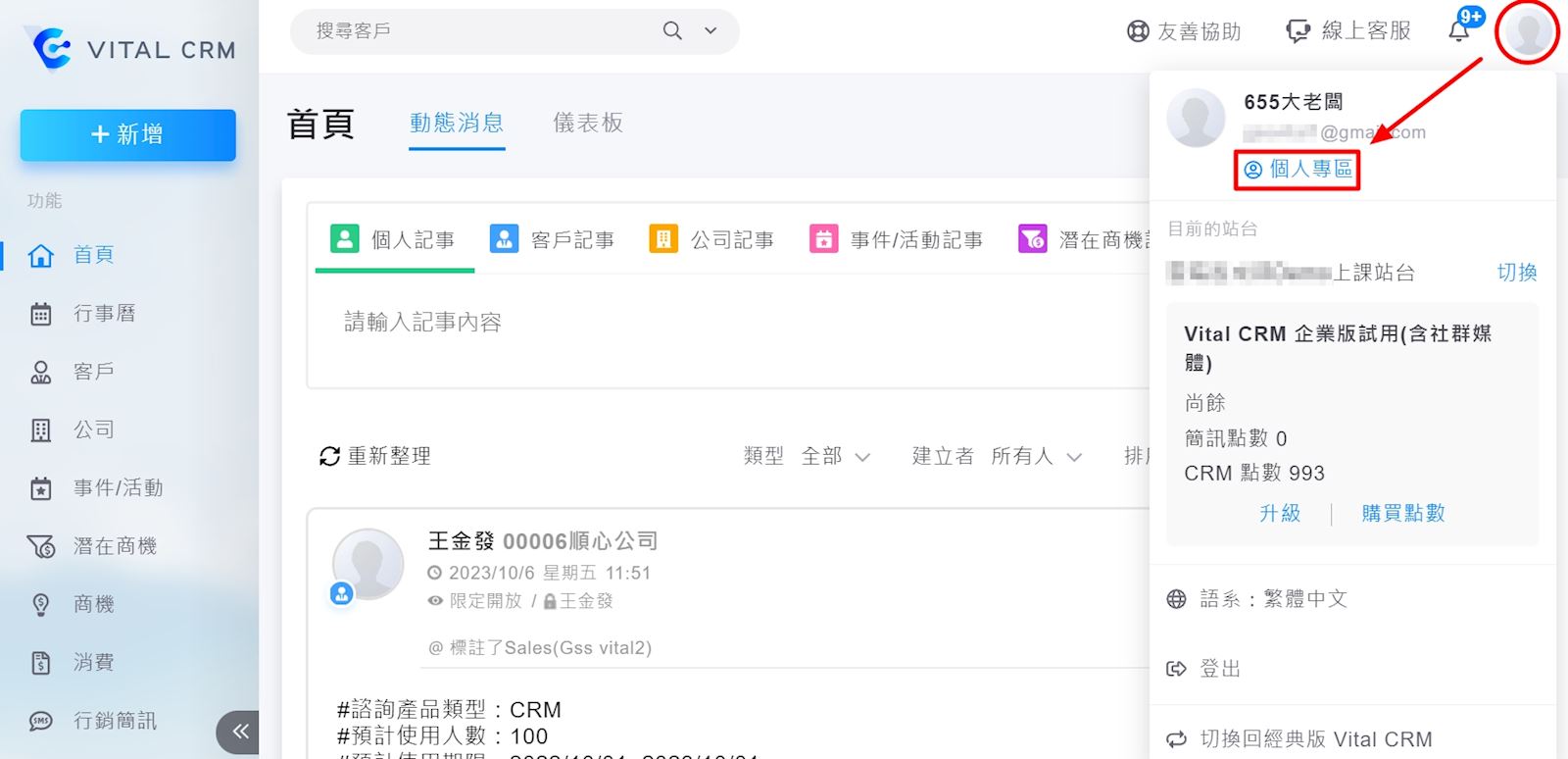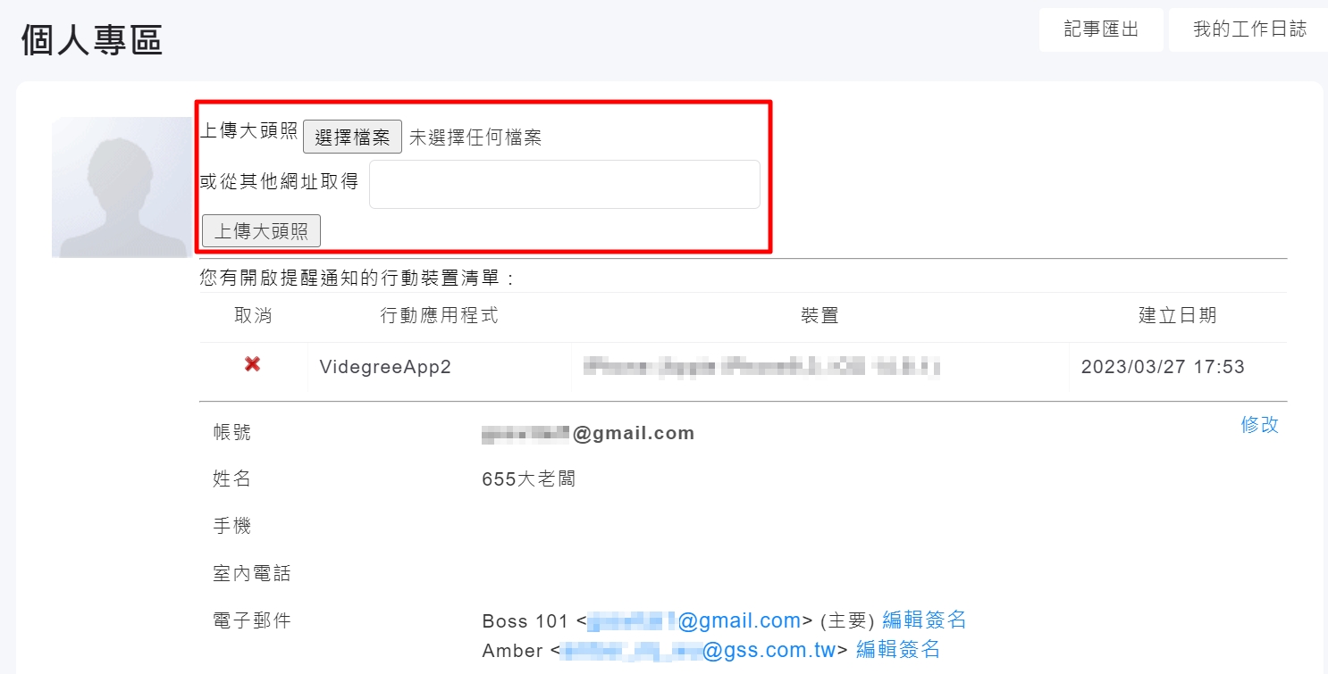 若需要上傳大頭貼請點選右上方【頭像>個人專區】