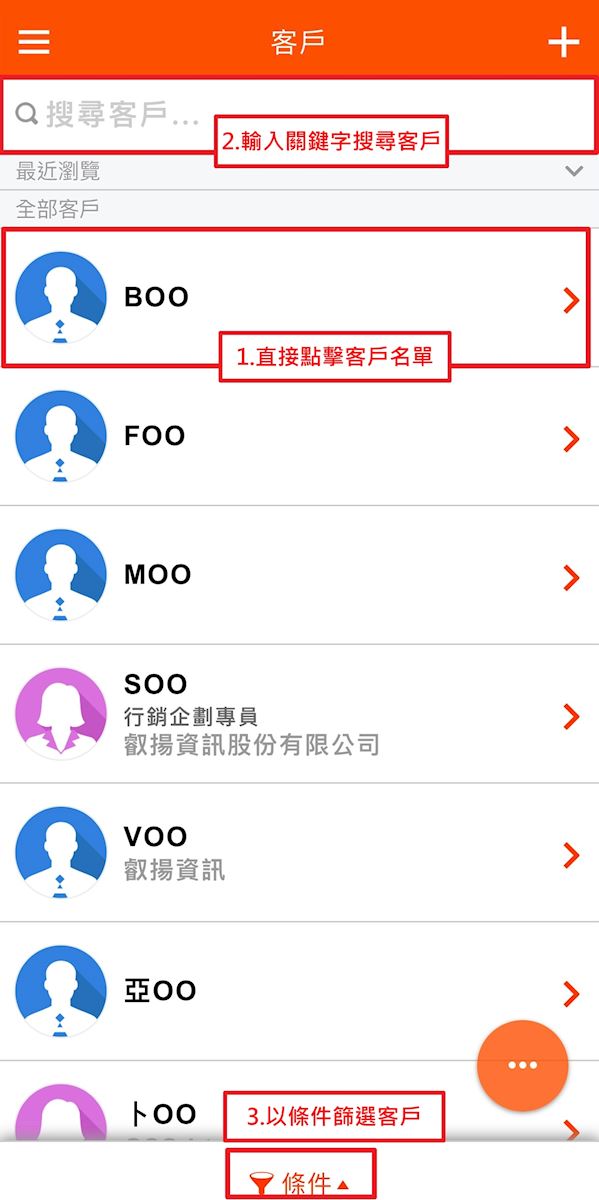 2. 您可以直接從客戶列表中點選,或利用上方的搜尋欄位及下方的【條件】查詢您要的客戶資料。