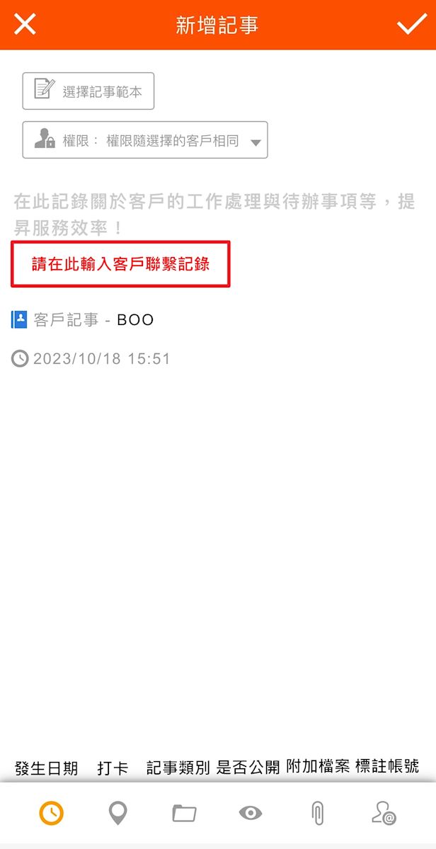 3. 進入頁面後,即可編輯記事,依下排功能可選用【發生日期】、【位置打卡】、【記事類別】、【是否公開】、【附加檔案】、【標註帳號】,使您的記事更加完整。