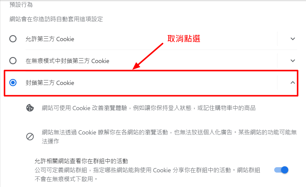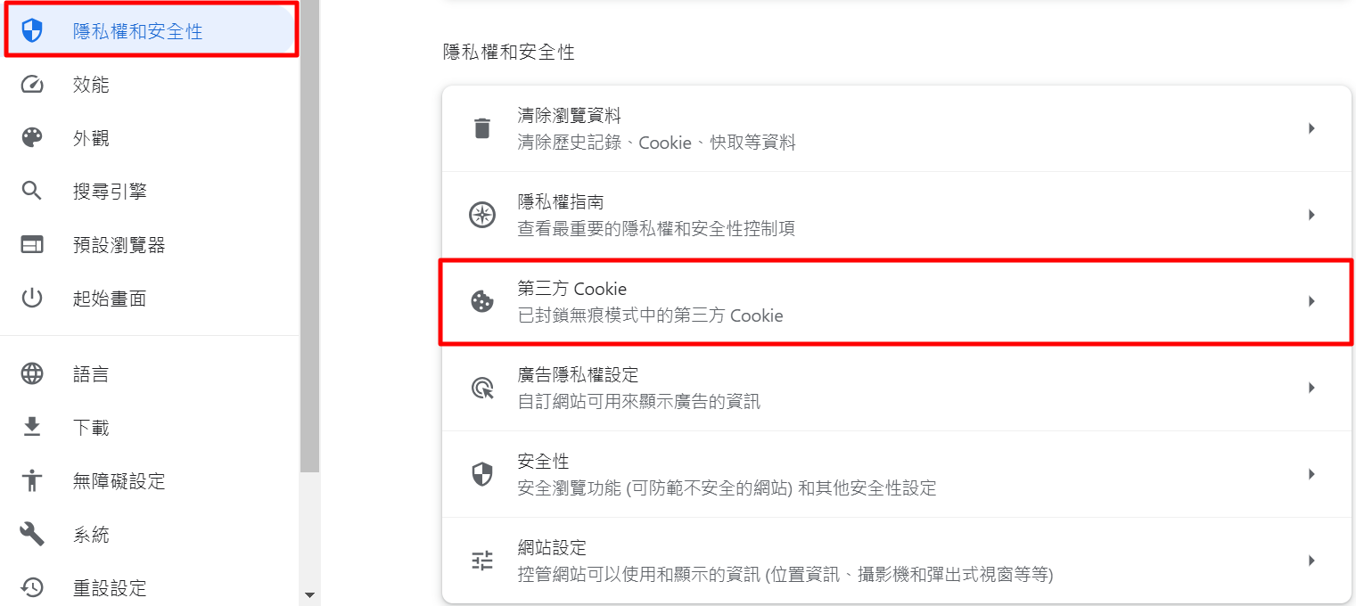 1. 請至【自訂及管理>設定>隱私權和安全性>第三方 Cookie】