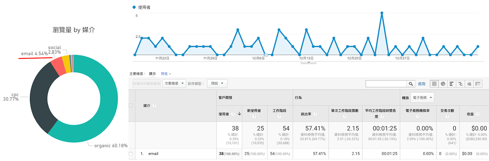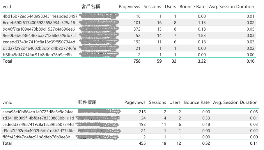 其中的utm_medium(媒介)為Google Analytics中本身就有的維度,在行銷郵件中的連結默認都設定為“email”,方便幫助行銷人員區分由行銷郵件帶來的流量。vcid(客戶ID)和vmid(行銷郵件ID)為自訂維度,需要在Google Analytics中額外設定(點這裡查看如何設定)才可以正確追蹤到連結是哪一個客戶點擊以及來自哪一封email。