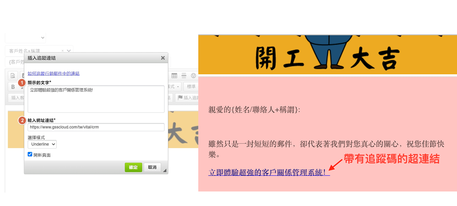 透過Vital CRM中“插入追蹤連結”的功能就可以方便地追蹤行銷郵件的發送成效。如下圖所示,行銷人員在編輯行銷郵件時,只需勾選插入追蹤連結(請見下方*),CRM則會自動在網址後增加追蹤碼方便掌握客戶是否有點擊以及點擊後在網站上的後續瀏覽行為。
