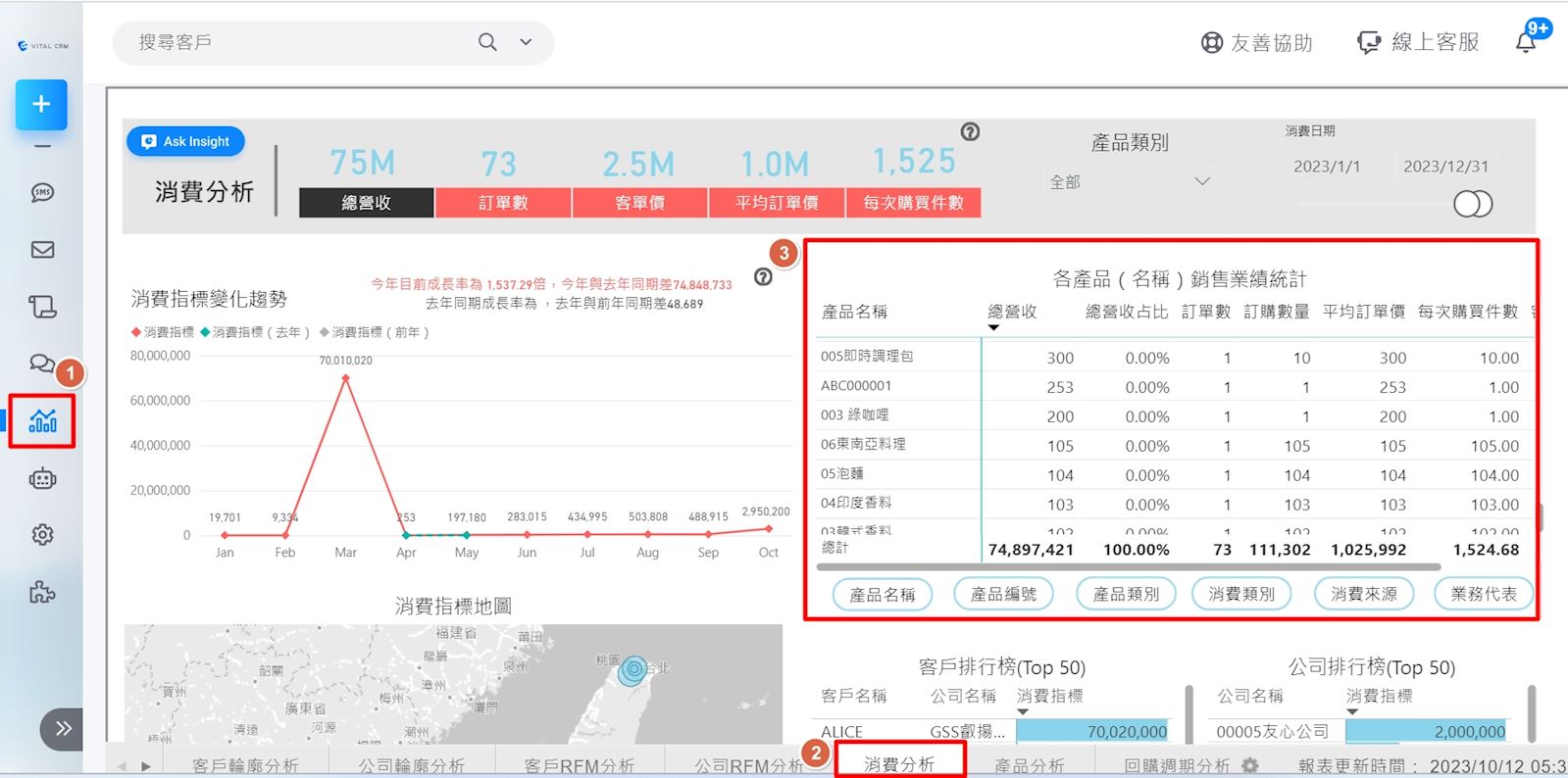 您可以利用【 insight 分析>消費分析】,看到各產品的銷售業績統計。