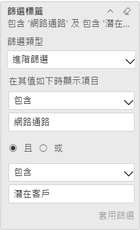 舉例來說:想篩選出擁有「網路通路」且也擁有「潛在客戶」標籤的客戶,則可利用此進階篩選功能,如下圖所示: