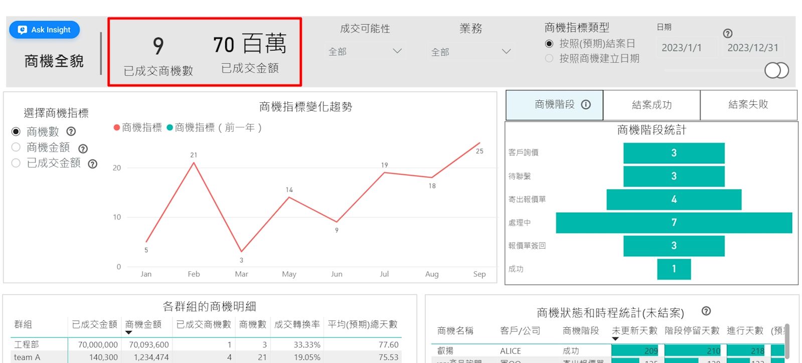 針對 Vital CRM 中的商機功能新增了結案和結案狀態(成功或失敗)的欄位,Insight 的「商機分析」中調整商機成交的定義為:已經結案且結案狀態為成功。因此商機的「成交轉換率」的計算方式也會依據結案狀態來做計算:結案狀態為成功的商機數量佔所有結案商機數量的比例。