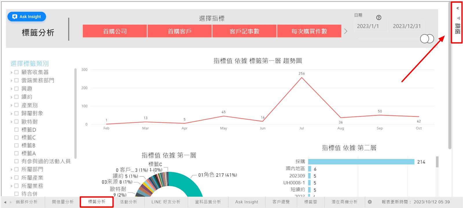 點入 Insight 分析後,在下方的頁籤中點擊「標籤分析」,接著點擊右側的「篩選」,展開篩選窗格。