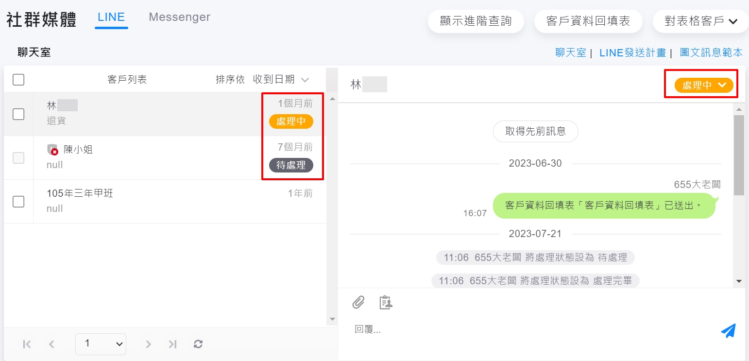 客戶詳細資料畫面的 LINE@ 頁籤中,也可以為此客戶設定處理狀態。