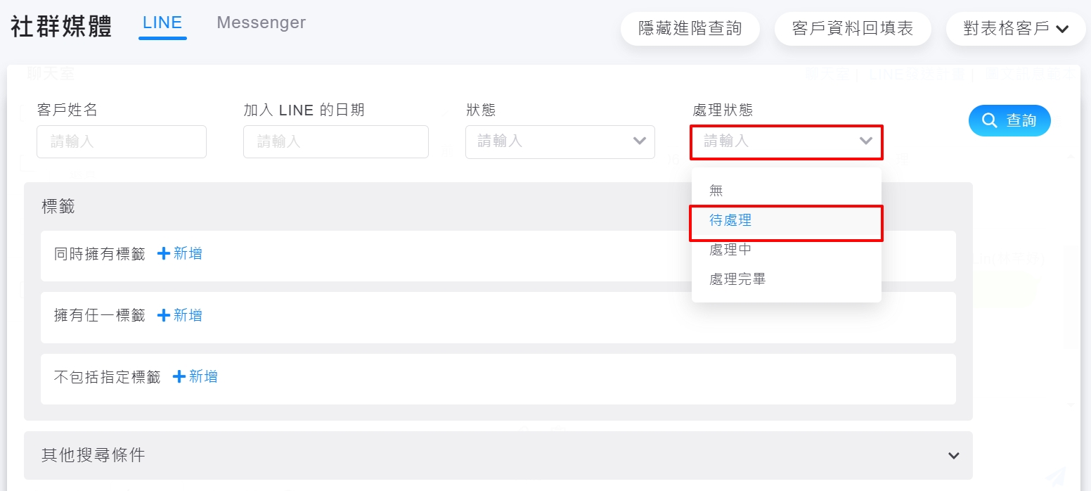 可以使用「處理狀態」作為 LINE 聊天室的篩選條件。